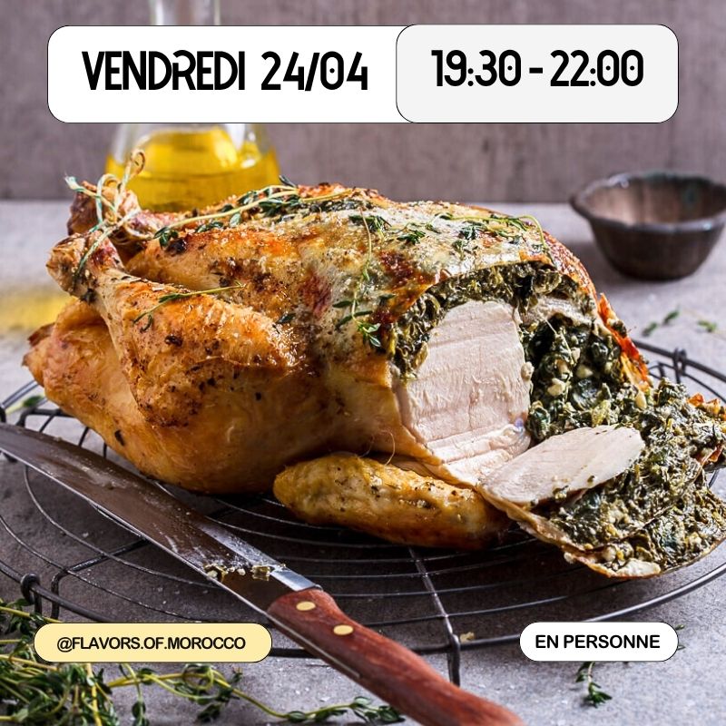 The highlight of the evening is Stuffed Coquelets with Couscous — tender, juicy small birds delicately stuffed and served with fragrant couscous. A generous and flavorful dish that embodies the richness and elegance of Moroccan cooking.